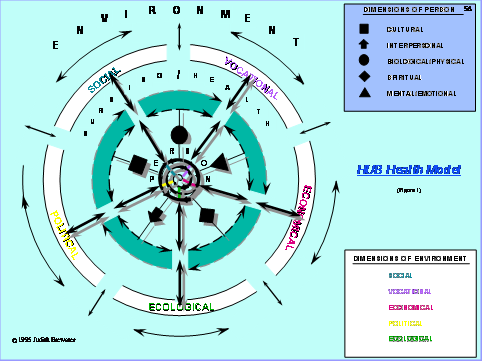 The (HUB) health model utilizes the meta-paradigms of nursing: person/family, environment, nurse, and health and focuses on the inter-relatedness of dimensions using the nursing process; Assessment, Planning, Intervention and Evaluation. In the HUB health model, nurse or manager and health (the construct) are viewed as a synergistic dimension that holds the key to optimum outcomes (wellness or balance). Thus HUB is administrative in concept and design.