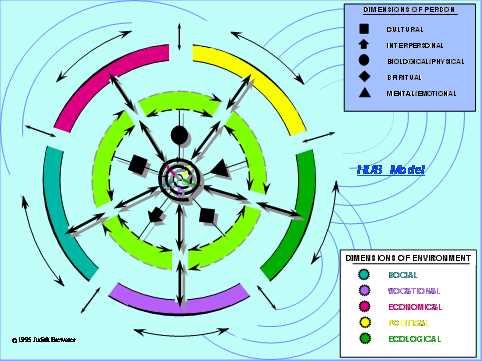 The HUB model is a unique, multidimensional, multicultural, universal conceptual model that consists of the comprehensive synthesis of five dimensions and elements of person and five dimensions and elements of environment. The model is process oriented, and enables collaboration within and among shared dimensions that address quality, accessible and affordable health care and that provide a systems approach to delivery of services.